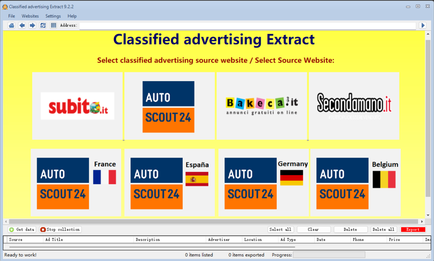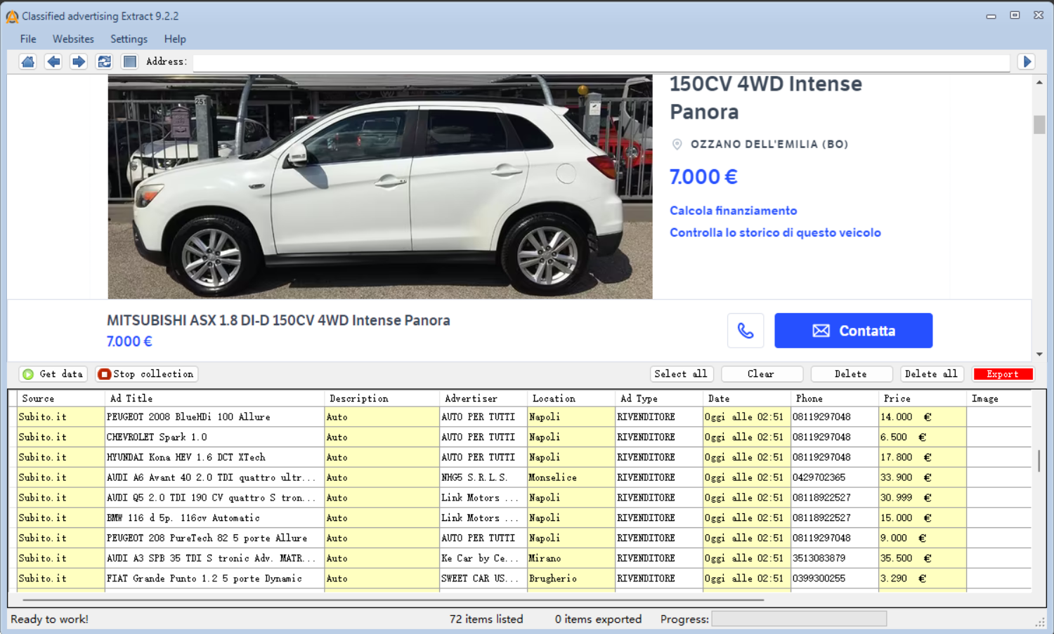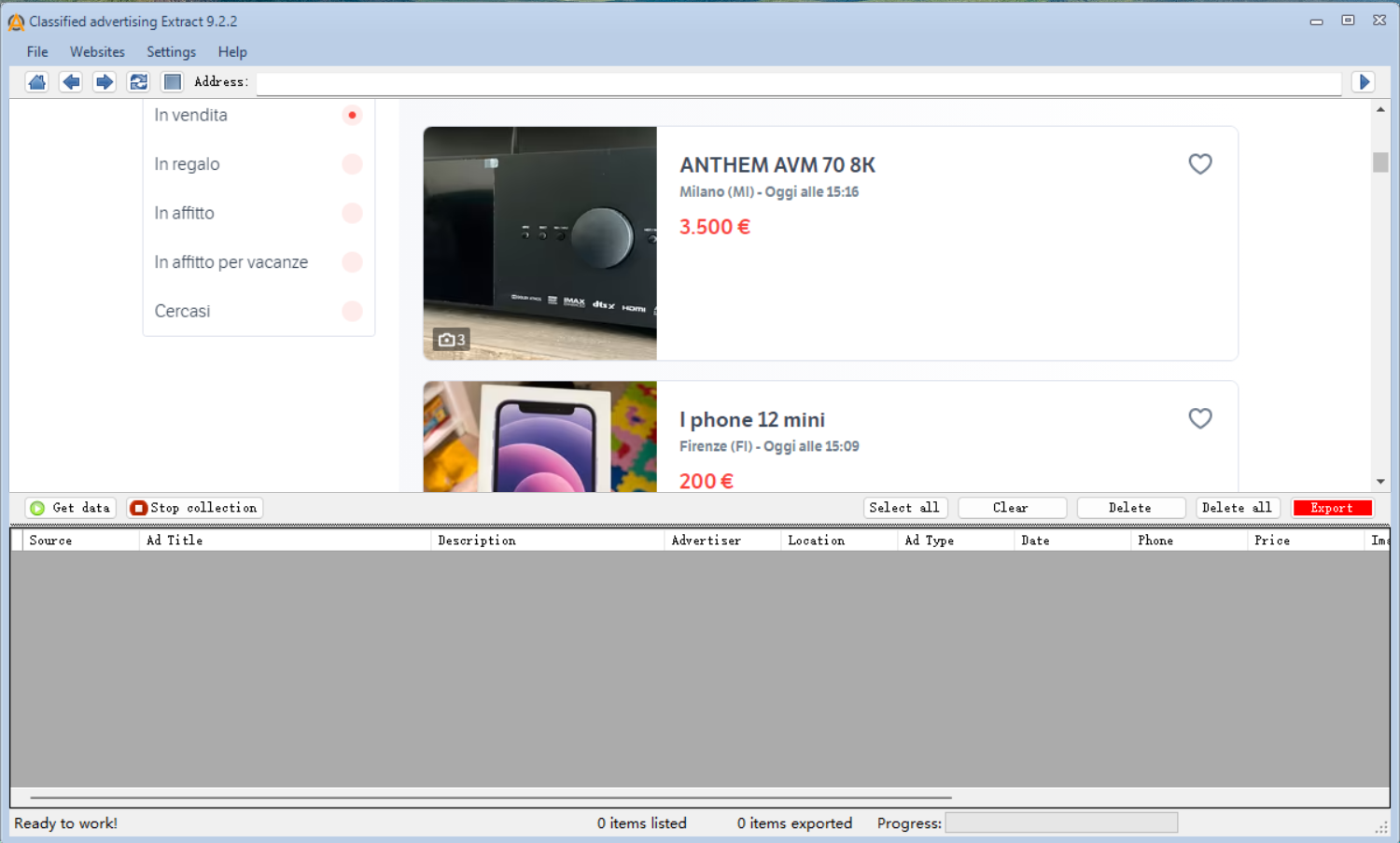 With this application you can carry out 100% customizable searches to obtain targeted user(both PRIVATE and COMPANIES) to contact by telephone (or via email) or lists of advertisements to be consulted comfortably in off-line mode . Just select the source (ebay, bakeca, Secondamano.it,..), then select category and as soon as the page opens with the adverts in that category, click on the “Get date” button and that's it! All results will be extracted and formatted into a list that you can view and save in a CSV, TXT or EXCEL file.