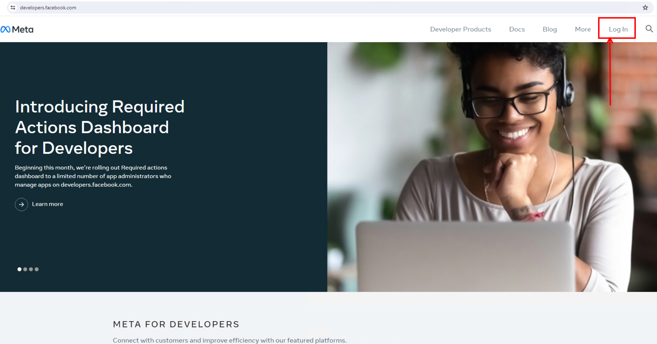 STEP 2. Click on Login in option from the meta for developers page, where you need to login with your Facebook account.