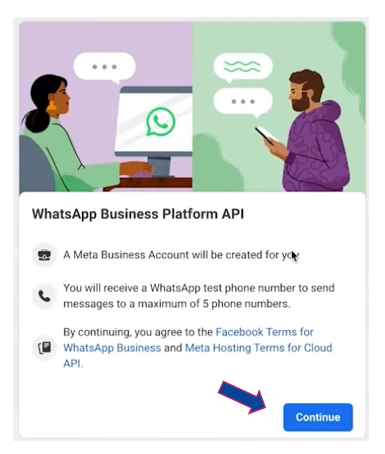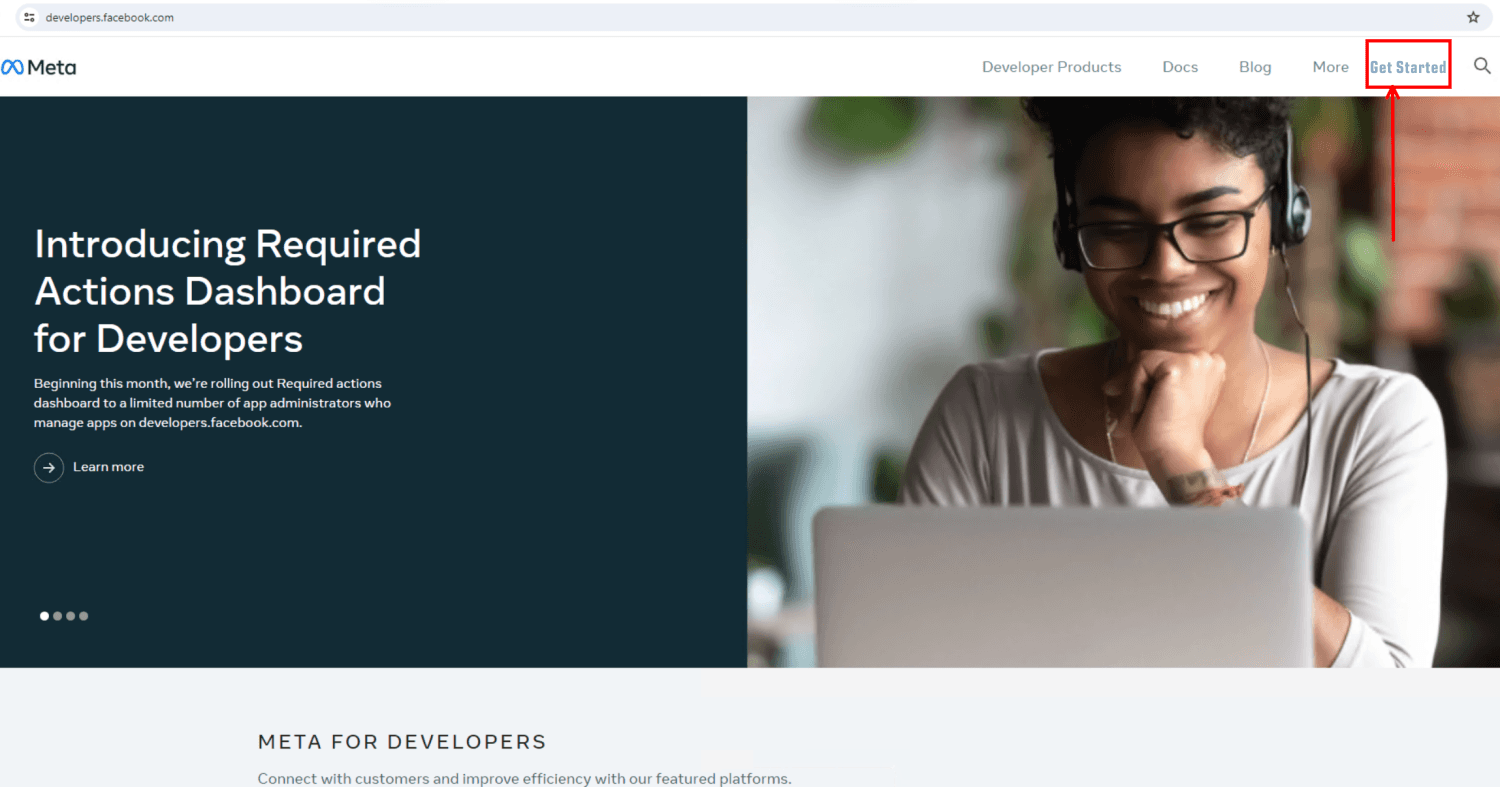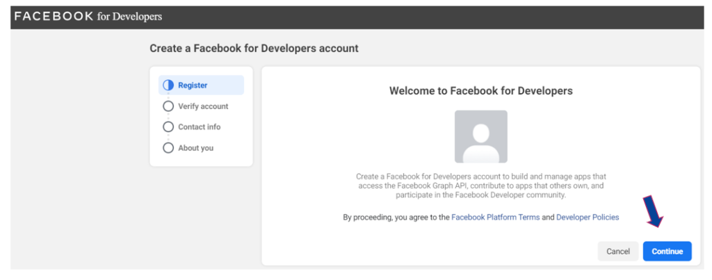 STEP 4. You need to create a Facebook for developers account. Click on Continue button to Get Started.