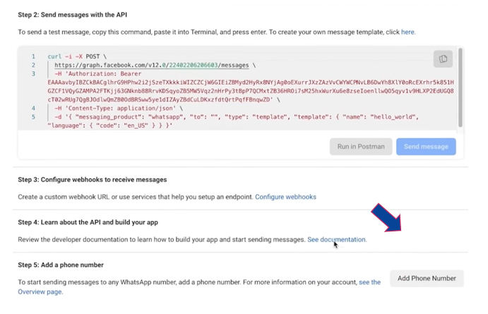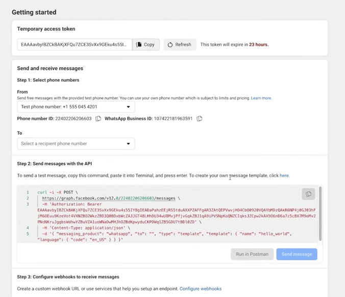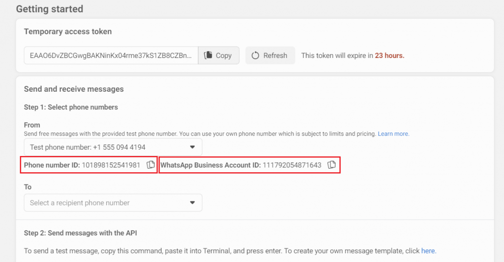 STEP 18. Now, the Phone number ID, Temporary Access Token and WhatsApp Business Account ID is ready to use.