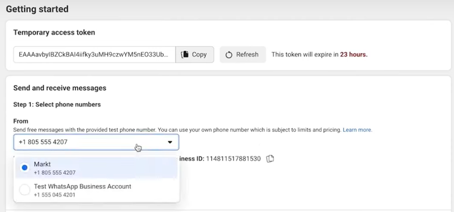 STEP 12. Here you can start testing the cloud API with a testing number that is provided by Facebook.