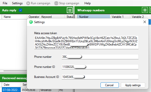STEP 19. Open WhatsApp Business CloudAPI software, go in SETTINGS and enter the Token, Phone Number, Phone number ID and Business Account ID, as shown in figure below.
