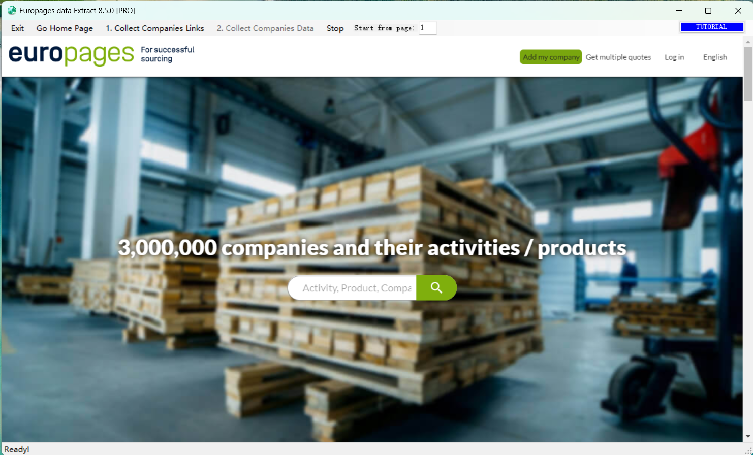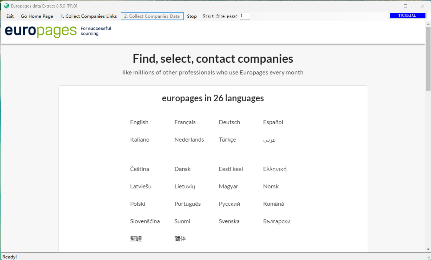 STEP 2. Choose the language version you desire: English, Chinese,Francais, Deutch, Espanol, Italiano, etc. Then the Europages homepage will open in the program: