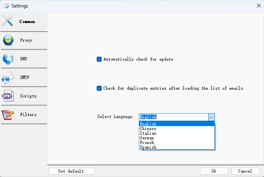COMMON SECTION: it is the initial settings screen and here in addition to the language of the program you can decide whether to automatically check for updates and activate the removal of double emails during loading email lists.