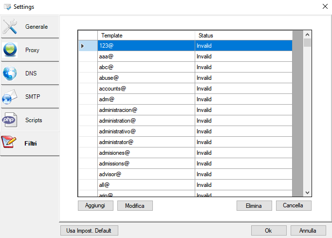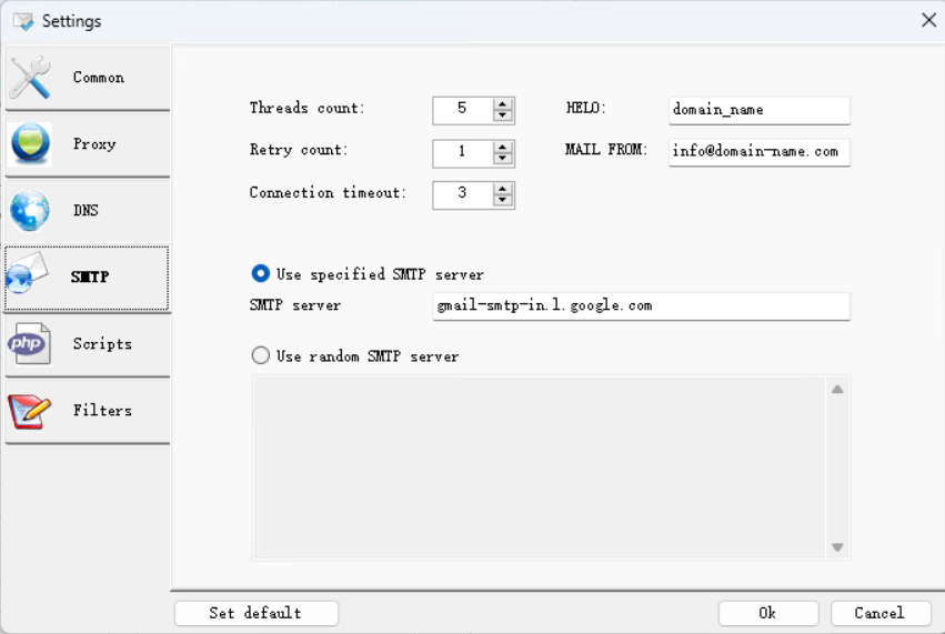 SMTP: allows you to set the number of Threads (ie number of emails verified simultaneously), the number of attempts and the timeout. You can also set up a HELO (usually it is given by a domain name or an IP address, and the “sender” email with which to make the checks (MAIL FROM). if you want you can enter other SMTP Servers and use them randomly to verify email addresses.