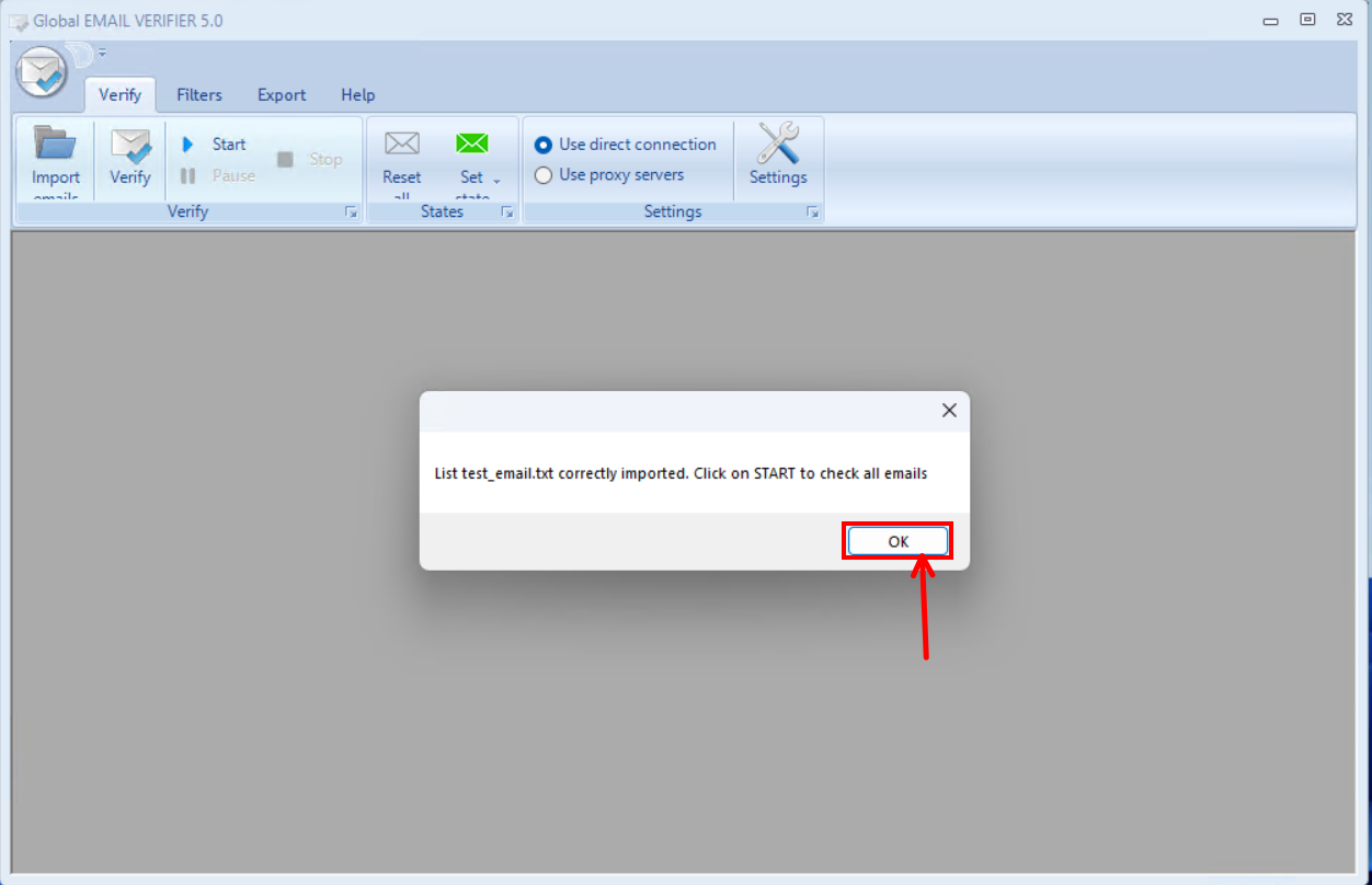 STEP 2. The above guide shows the ease of use of Global EMAIL VERIFIER. Unlike other similar programs on the market this is perhaps the simplest that does not require action by the user and leaves no doubt about the validity or invalidity of email addresses.