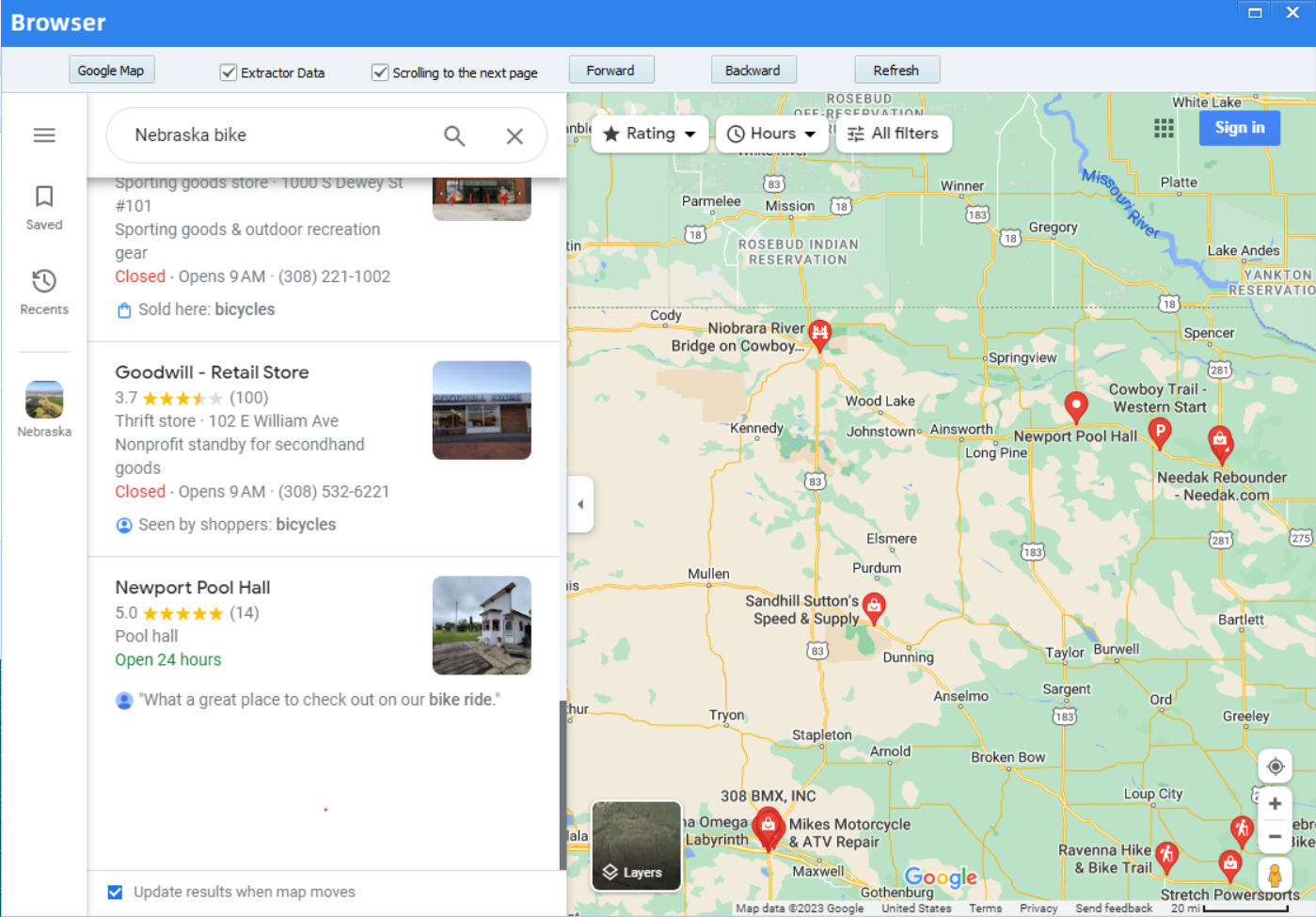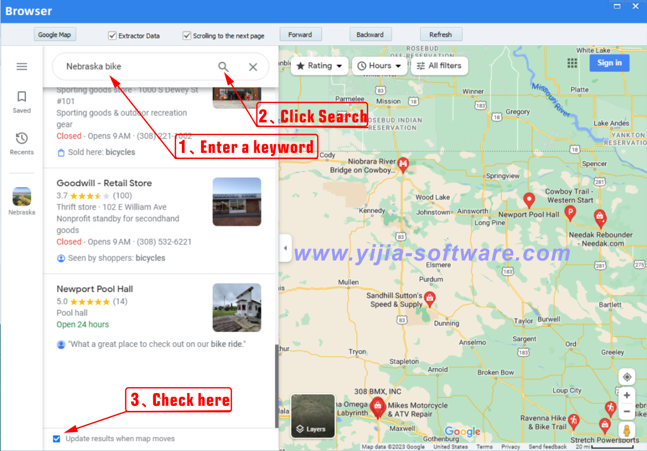 STEP 4. Find the country you want to collect, zoom the map to the city, enter keywords, and click the search icon.Check 'Update results when map moves' below the collected data.