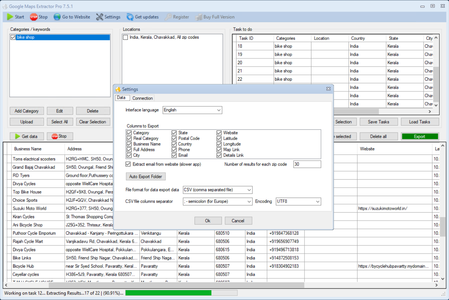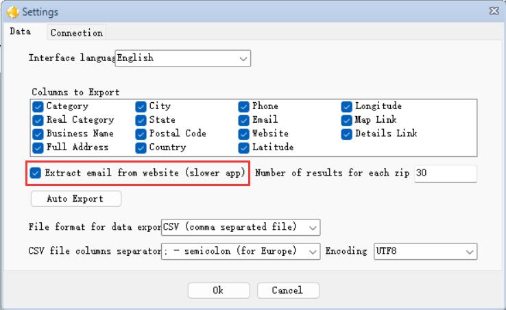 Before starting the scan, click SETTINGS –> Data and set the data to export. If you desire to extract more email address please select the box “Extract emails from websites” as shown in figure below: