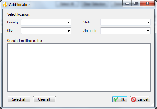 About “location” windows, you will be able to select the Country, State, City and ZIP CODE: