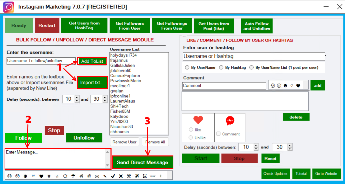 Instagram Marketing also offers a powerful Bulk Direct Message Sender feature. In fact, you can upload a list of users (instagram accounts), write and send the message to everyone.