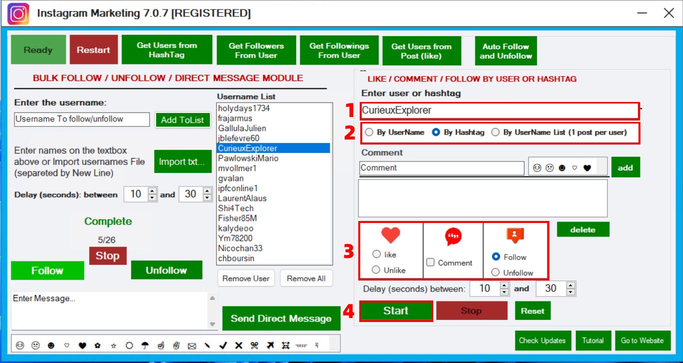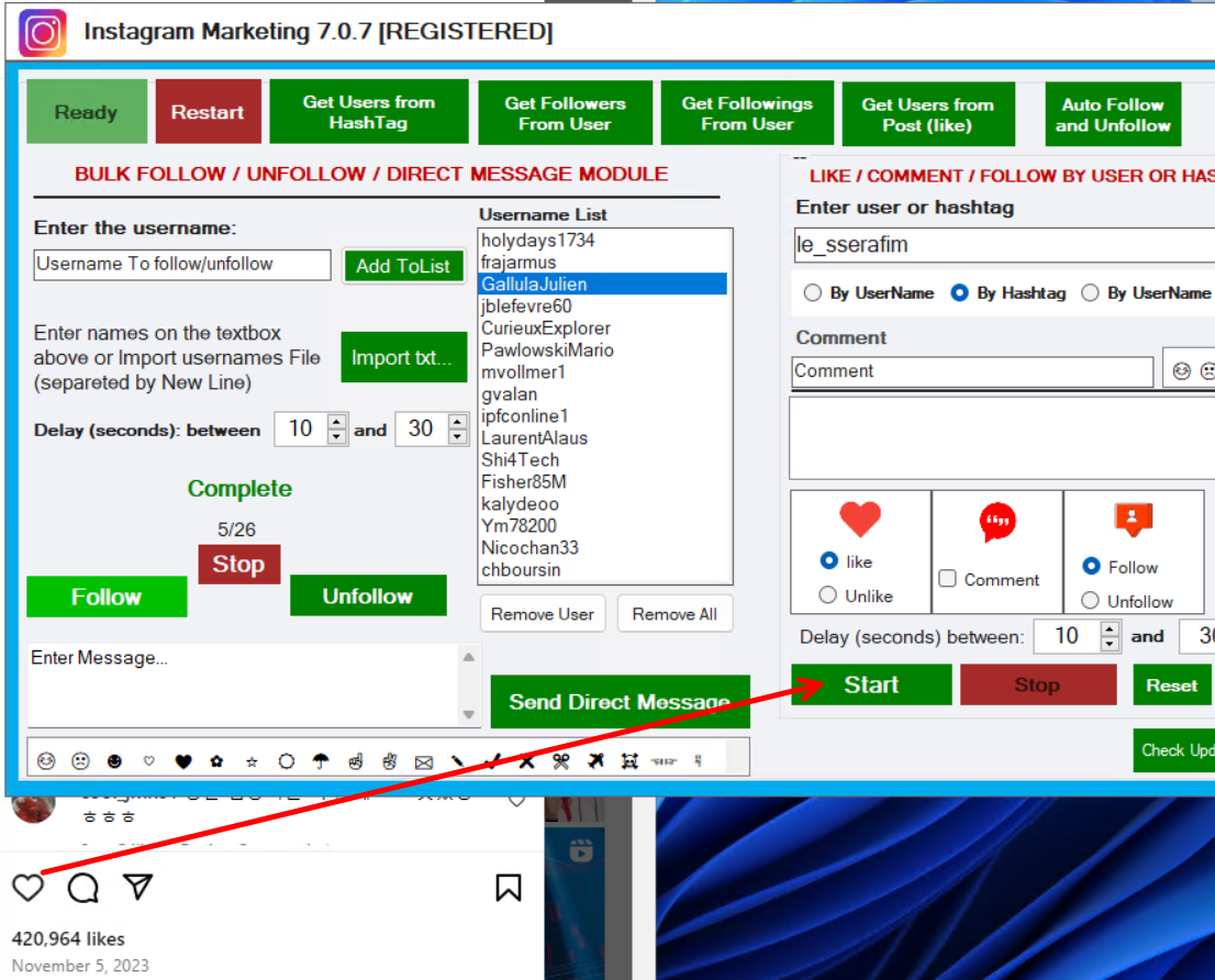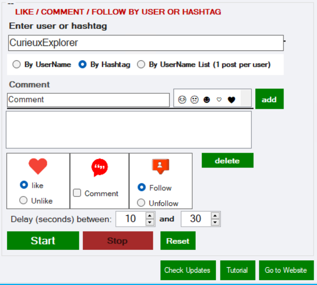 From the module on the right of the program you can add “Like” to all the photos of a particular profile or to all the photos of a specific #hashtag. Enter the user or hashtag, select the “By Username” or “By Hashtag” checkbox, at the bottom select the “Like” or “Unlike” box and finally click on START. You can also select the option “By Username List” if you want to send like or comment to the first post of a list of users.