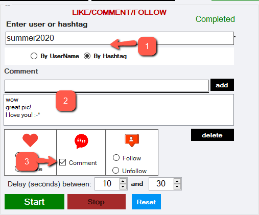With the demo version a maximum of 5 Comments can be added at a time, with the FULL version instead up to 300 per user / hashtag (all automatically).