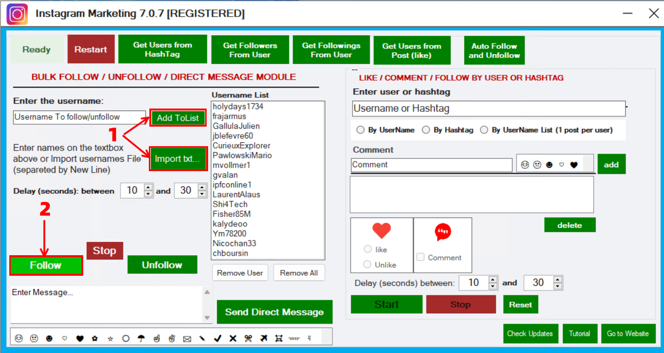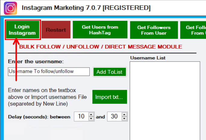 Once you have a list of Instagram profiles you want to follow, all you have to do is import them into the program (or manually write them in the relevant box)