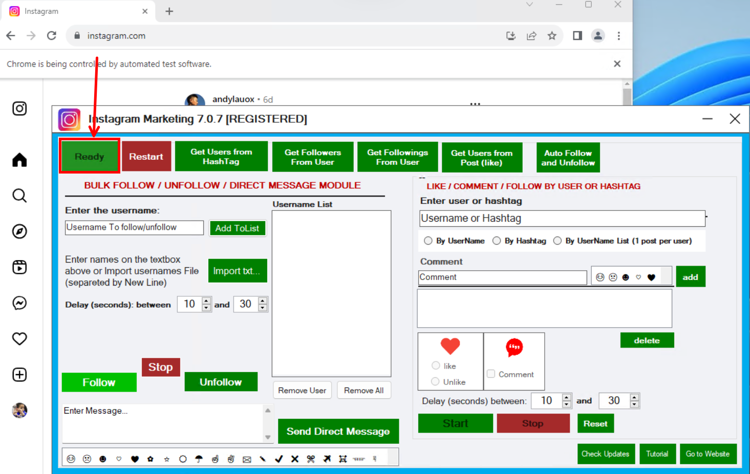 STEP 4. After entering your username and password, click on LOG IN and a Google Chrome window will automatically open. You will be logged into the Instagram page and logged in. Wait until logging into your Instagram account is complete. Once logged in you will see the Instagram Marketing main screen with “READY” on the top left button.