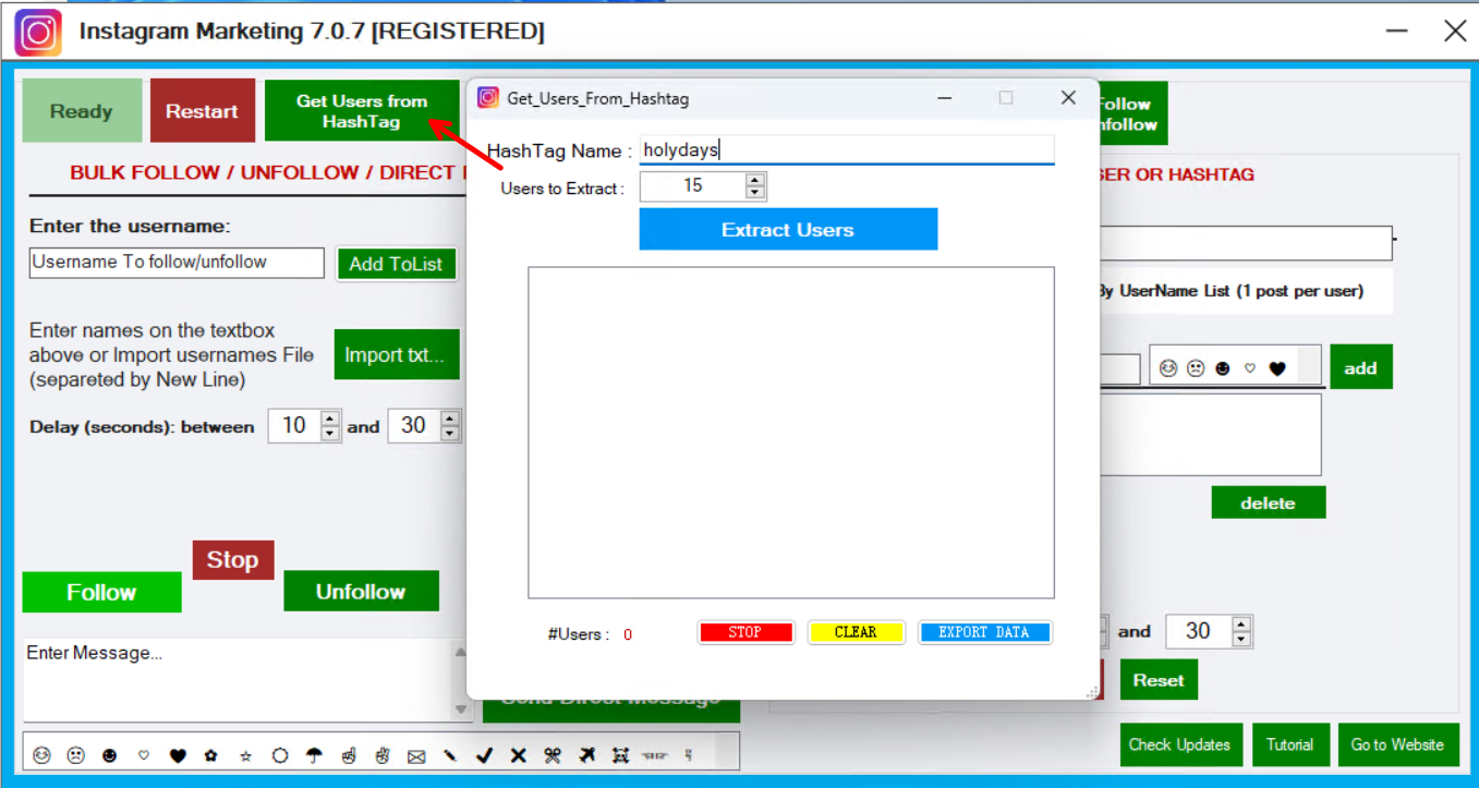 To get users (profiles) based on certain #hashtags, click on the GET USERS FROM HASHTAG button at the top and in the window that opens enter the hashtag name and the number of users to extract (with the demo version you can extract a maximum of 15 names ).