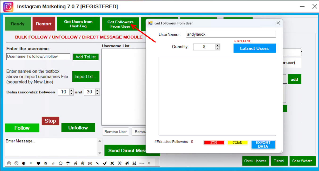 If you want to extract the followers (or following) of a particular user (even from your own profile), click on the GET FOLLOWERS FROM USERS (or Following) button and enter the username and number of followers (or following) to extract. With the demo version it is possible to extract a maximum of 15 followers per user.