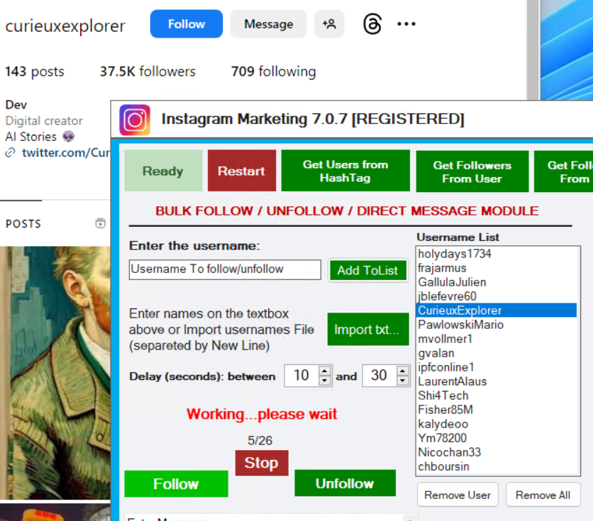 The program will automatically open all the posts related to that hashtag and will start clicking on “Follow” on the various profiles found. With the demo version a maximum of 5 profiles will be scanned automatically, with the FULL version the program will go on up to 300 “follow”.