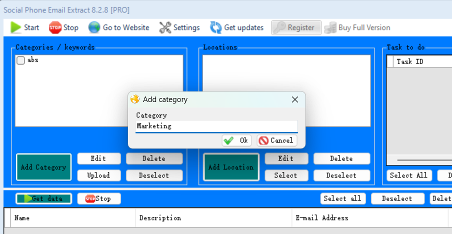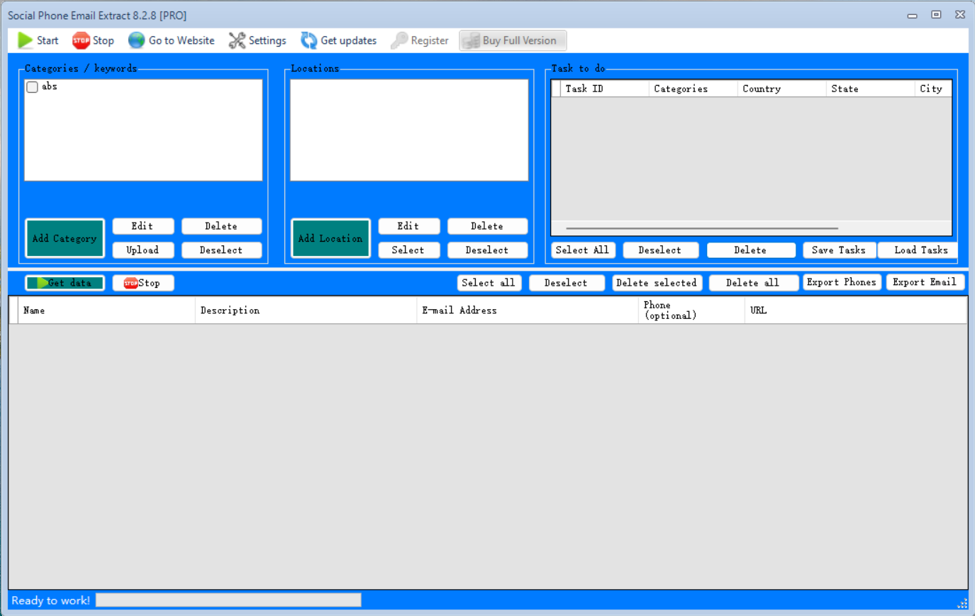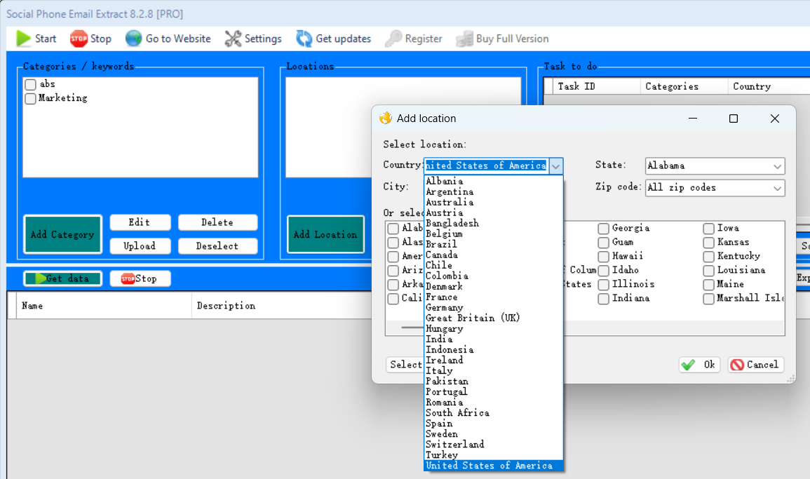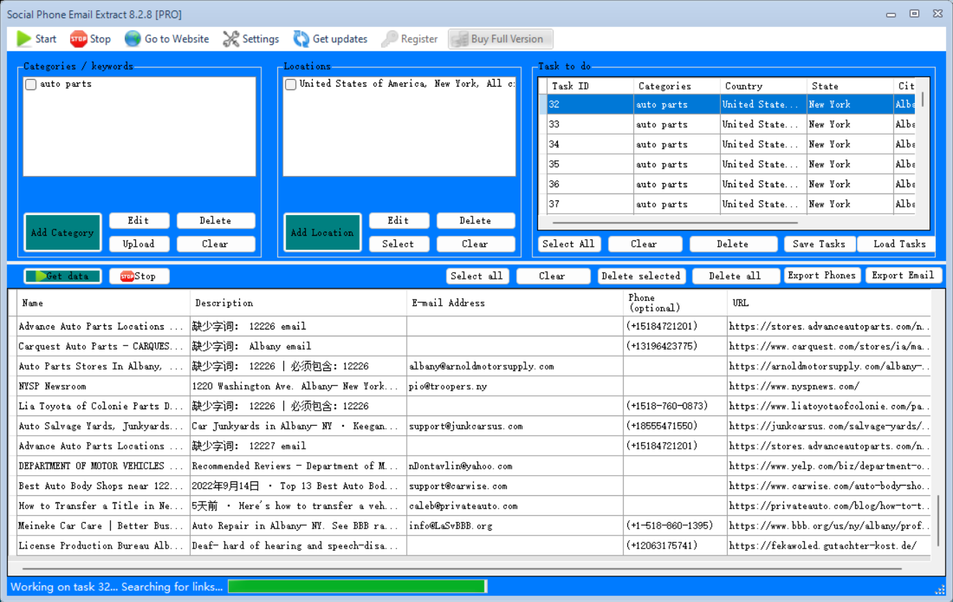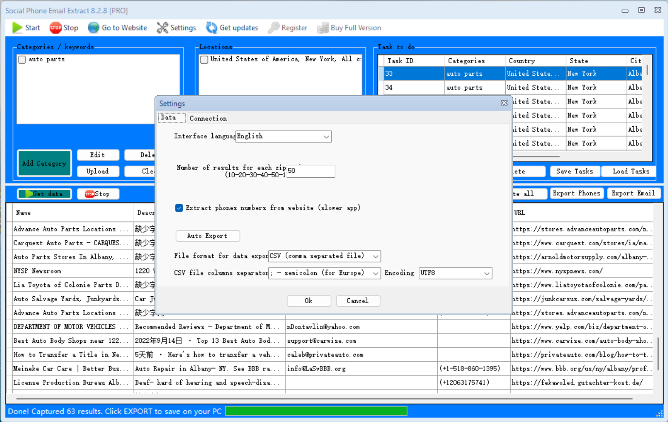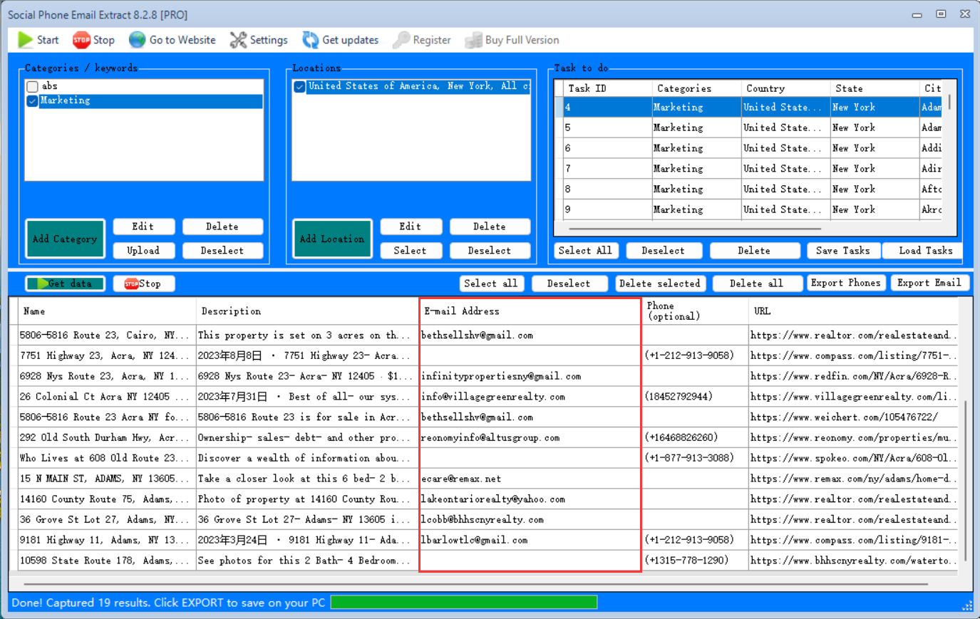 The power of Social Phone Email Extract is that the search will be done in all the locations (cap) displayed at the top right (tasks) of the program, in order to maximize the number of emails found. In addition to emails, the program will also search for any phone numbers (if published on the result site).