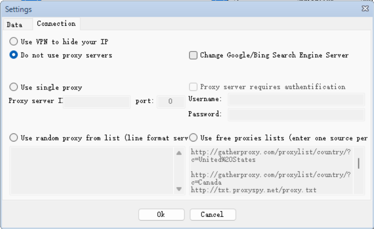 NB: If you let the program work for several hours it is possible that Google may temporarily block the search. In this case you can continue to use the program by switching from Google to the BING search engine. Go to Settings, click on the CONNECTION tab and then select the “Switch from Google to Bing“ box. Then press OK to return to the initial screen and proceed with the data extraction.