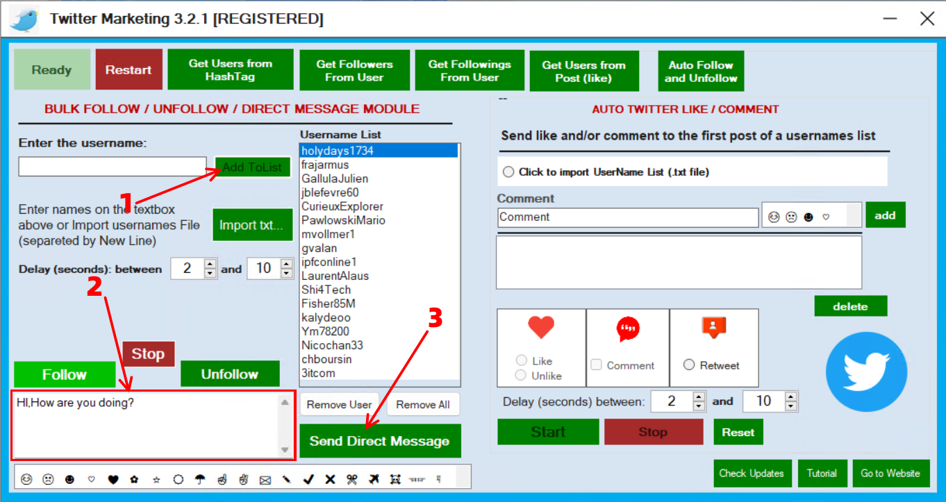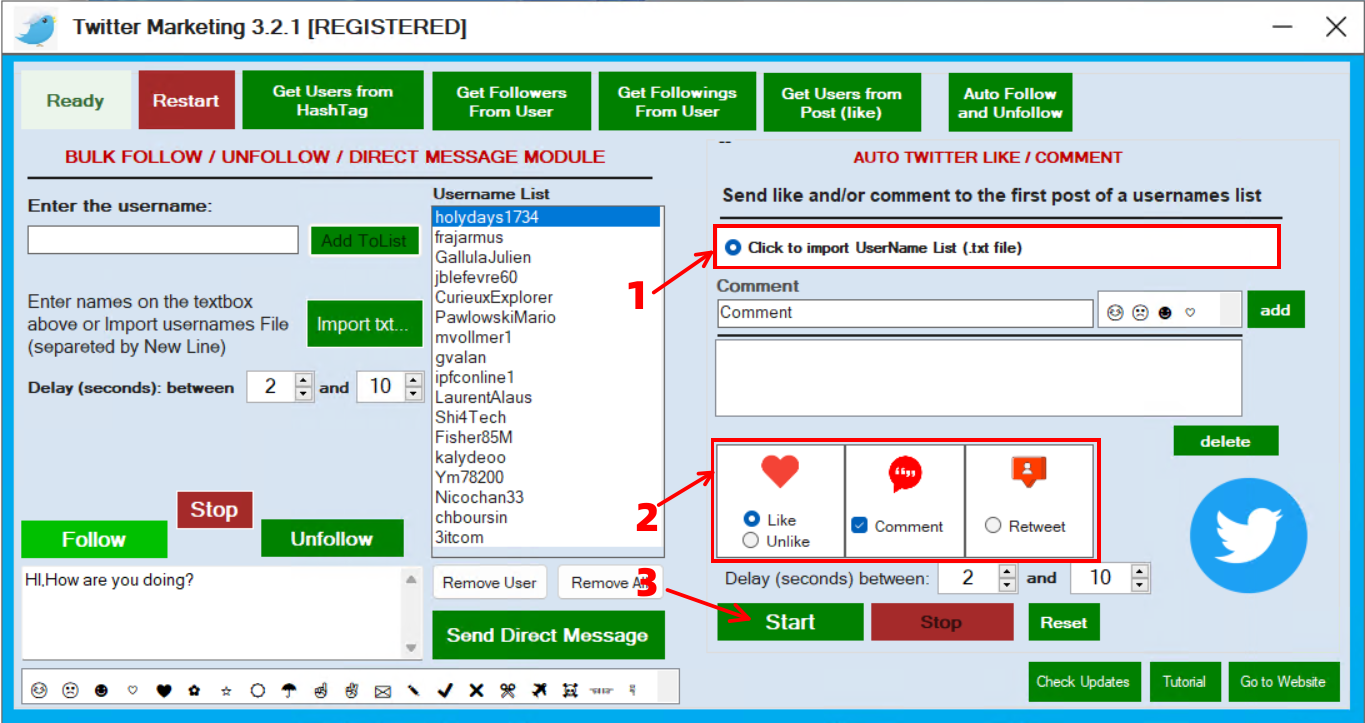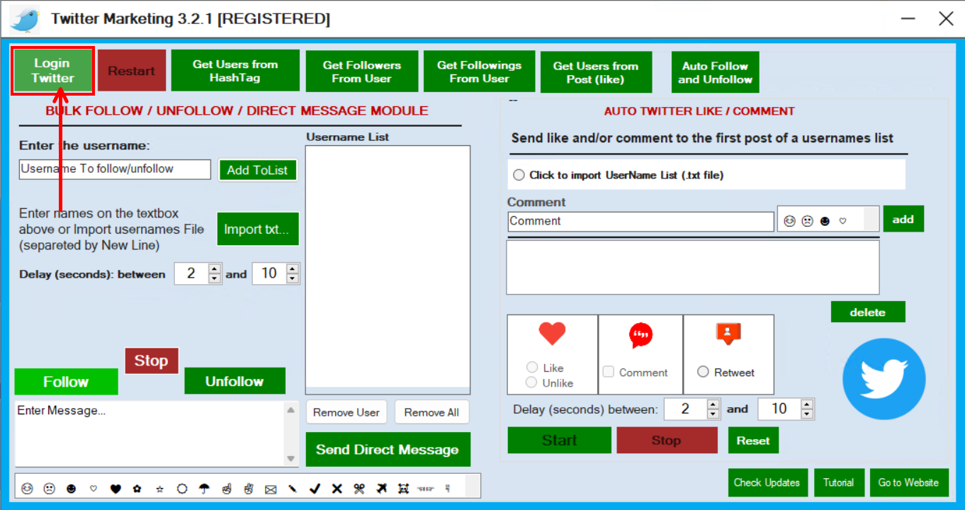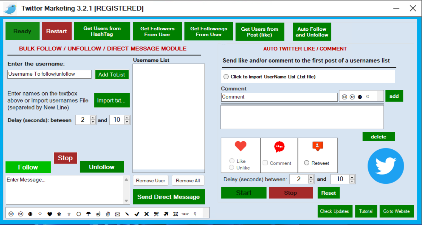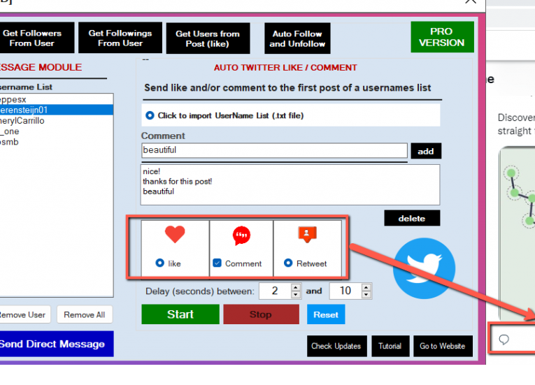 In the section on the right of the program there is the function that allows you to like, comment or retweet the most recent posts of Twitter users that are imported into the program. For each user uploaded, the program will comment / like / retweet only the first post (the most recent one). Of course, you can also choose just one of the three functions, or two of the three.