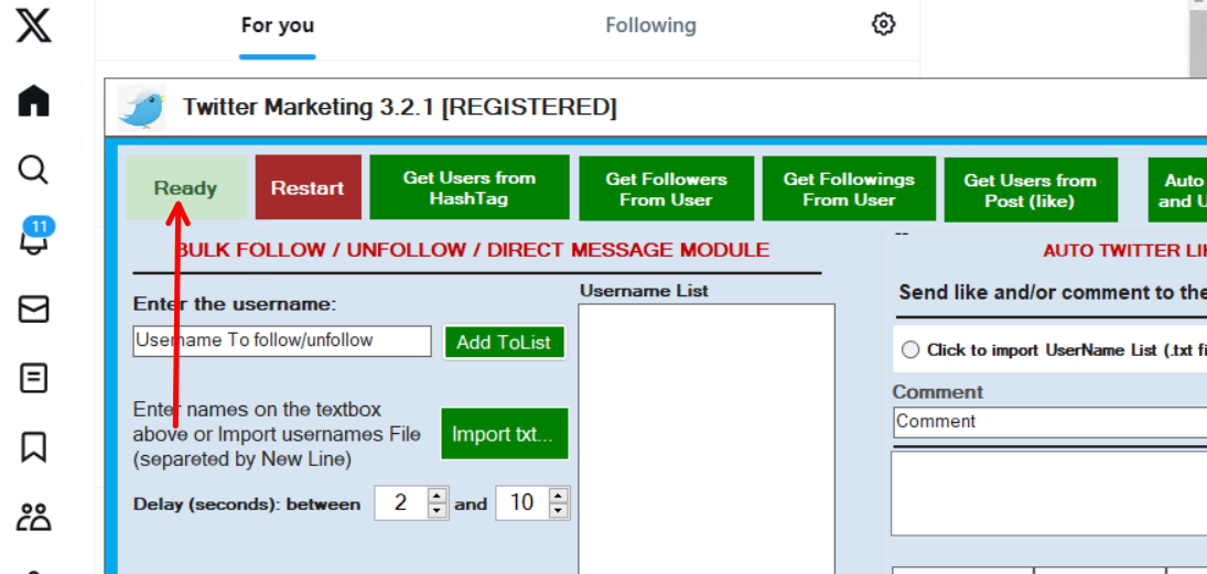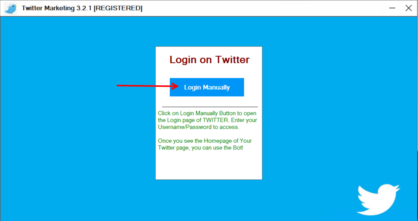 STEP 4. Click on the Login Manually button and the Google Chrome window and Twitter login page will open. Log in to your Twitter account by entering your user and password and once you have completed logging in you will see the main screen of Twitter Marketing with the words “READY” on the button at the top left.