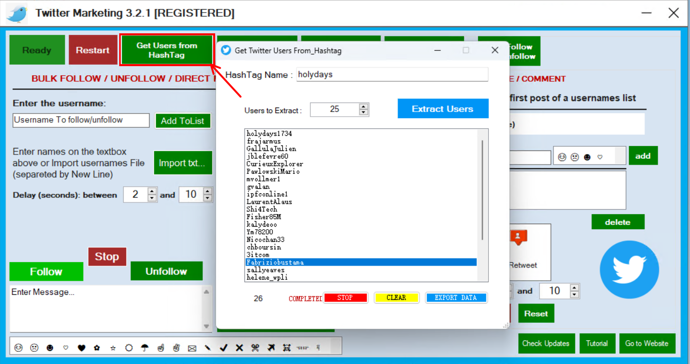 Make sure you don’t close that window until the end of sending messages. If you do not yet have the list of followers saved on your computer, use the GET FOLLOWERS FROM USER function on the menu at the top of the program. This list will be saved in a txt file on your computer and then you can upload it to the program to send the desired message.