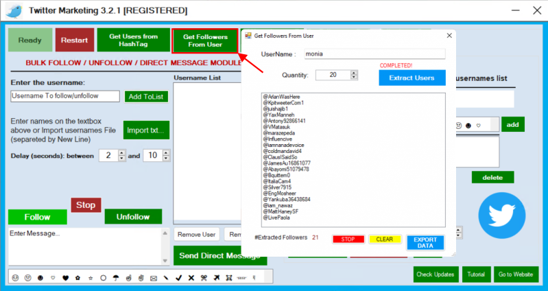 If you want to extract the followers (or following) of a particular user click on the GET FOLLOWERS FROM USERS (or Following) button and enter the username and number of followers (or following) to be extracted. With the demo version you can extract a maximum of 20 followers per user.