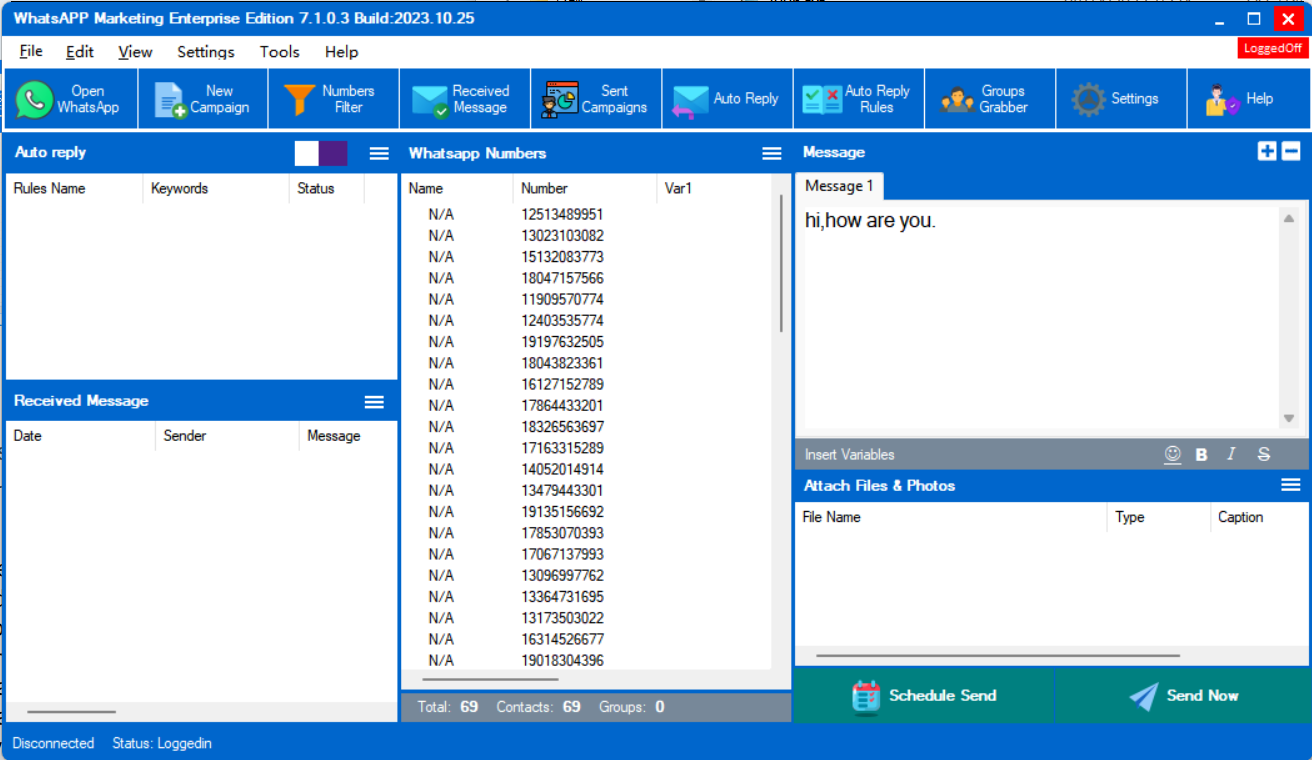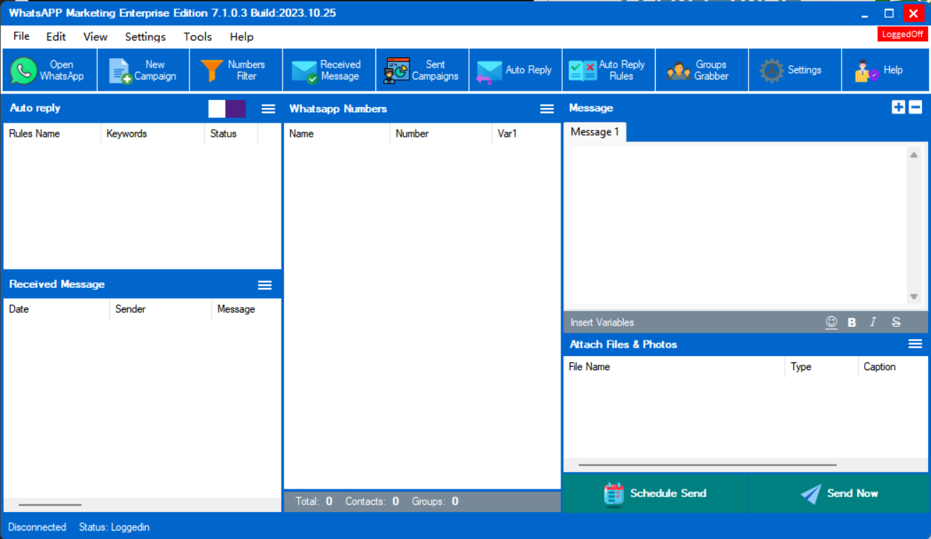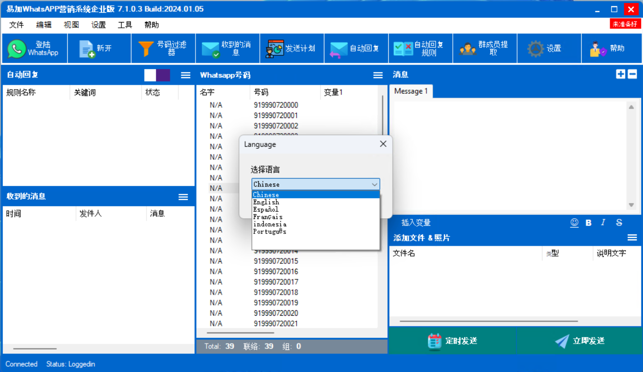 WhatsAPP Marketing Enterprise Edition can batch import or automatically generate and filter WhatsAPP numbers, batch send custom messages, set multiple message variables, extract group members, automatically answer robots, Automatic memory account, ChatGPT automatic AI chat, and other powerful functions.