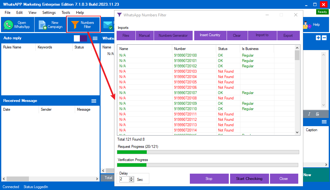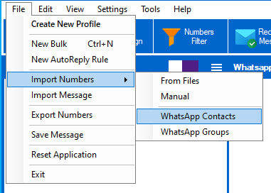 You can import the numbers either from excel, csv, txt files or enter them manually. We suggest to do not filter more than 1.5k numbers per time to avoid ban issues!