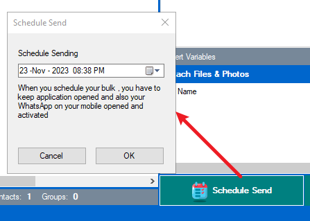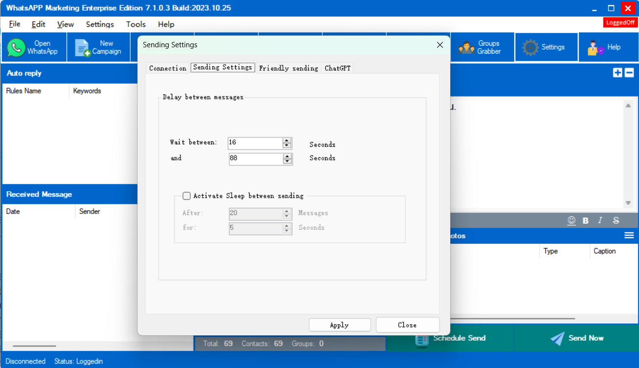 10. From Settings, in WhatsAPP Marketing Enterprise Edition, set a small delay between messages.