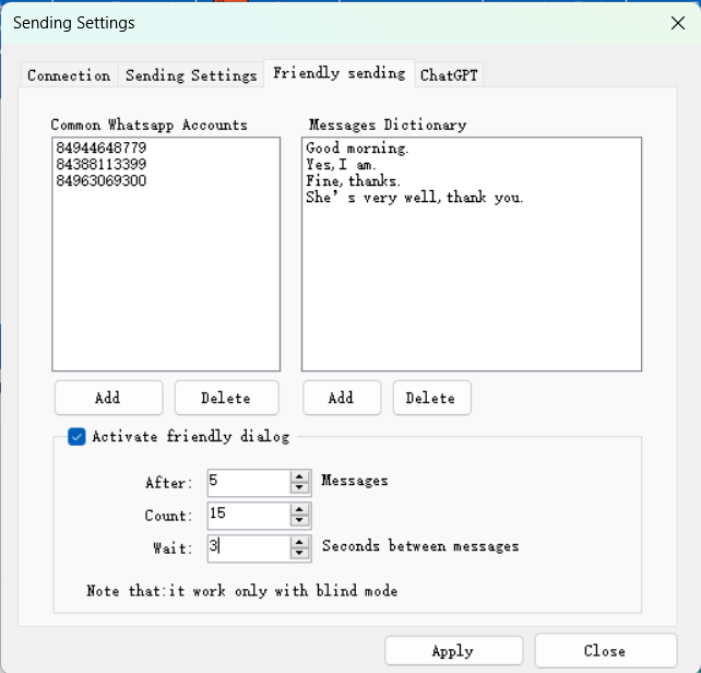 In the FRIENDLY SENDING section you can instead enter your other WhatsAPP numbers and set phrases that will be randomly sent to those numbers (during the sending of a campaign) in order to increase the reputation of the sending itself.