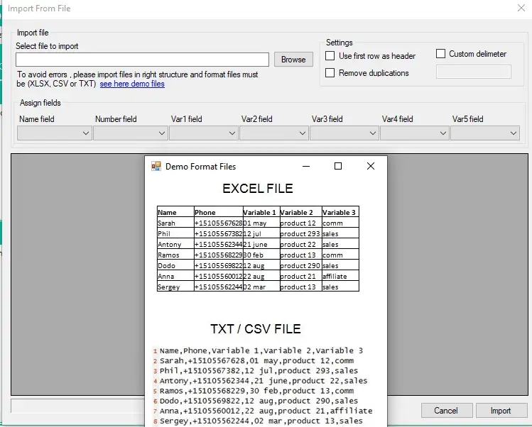 In the case of manual import, you can only enter phone numbers (with international prefix) or name and number separated by a comma. The advantage of entering the name is that you can send personalized messages by automatically inserting the name of that contact in the message itself.