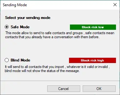 SAFE MODE: sends the message only to those contacts with whom you have had a conversation in the past. This mode is at very low risk of blocking/ban.
