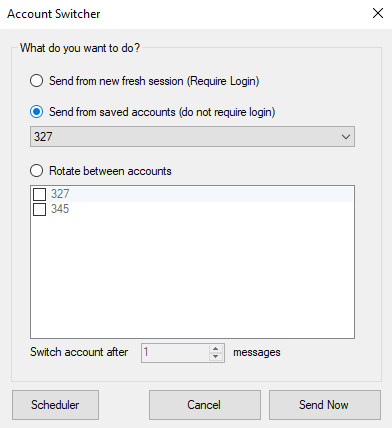 You can send from new fresh session (after login) or send from a saved whatsapp account (do not require login). You can also send messages from multiple WhatsApp account in “rotation” (e.g 20 messages per account).