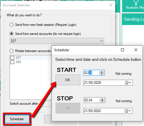 If you choose to send the message from an account saved in the program, the “Scheduler” button will also be activated at the bottom, which allows you to schedule the sending at a certain date and time.