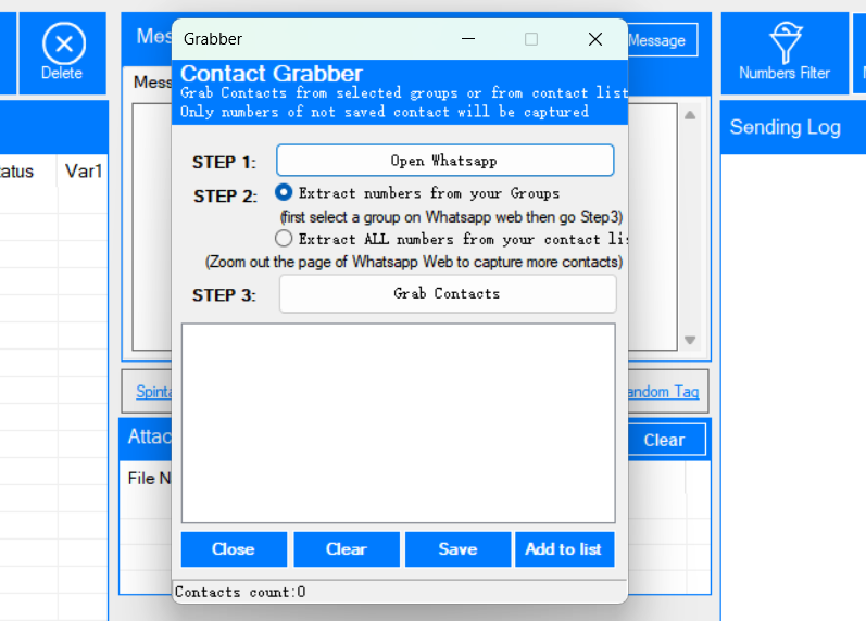 CONTACT GRABBER: this feature will allow you to grab all contacts from a selected whatsapp group. Just Open Whatsapp, scan the QR code from your phone, select the group and WhatsAPP Marketing Pro will extract all contacts. All contacts will be listed on the “contact grabber” window as you can see from image below.