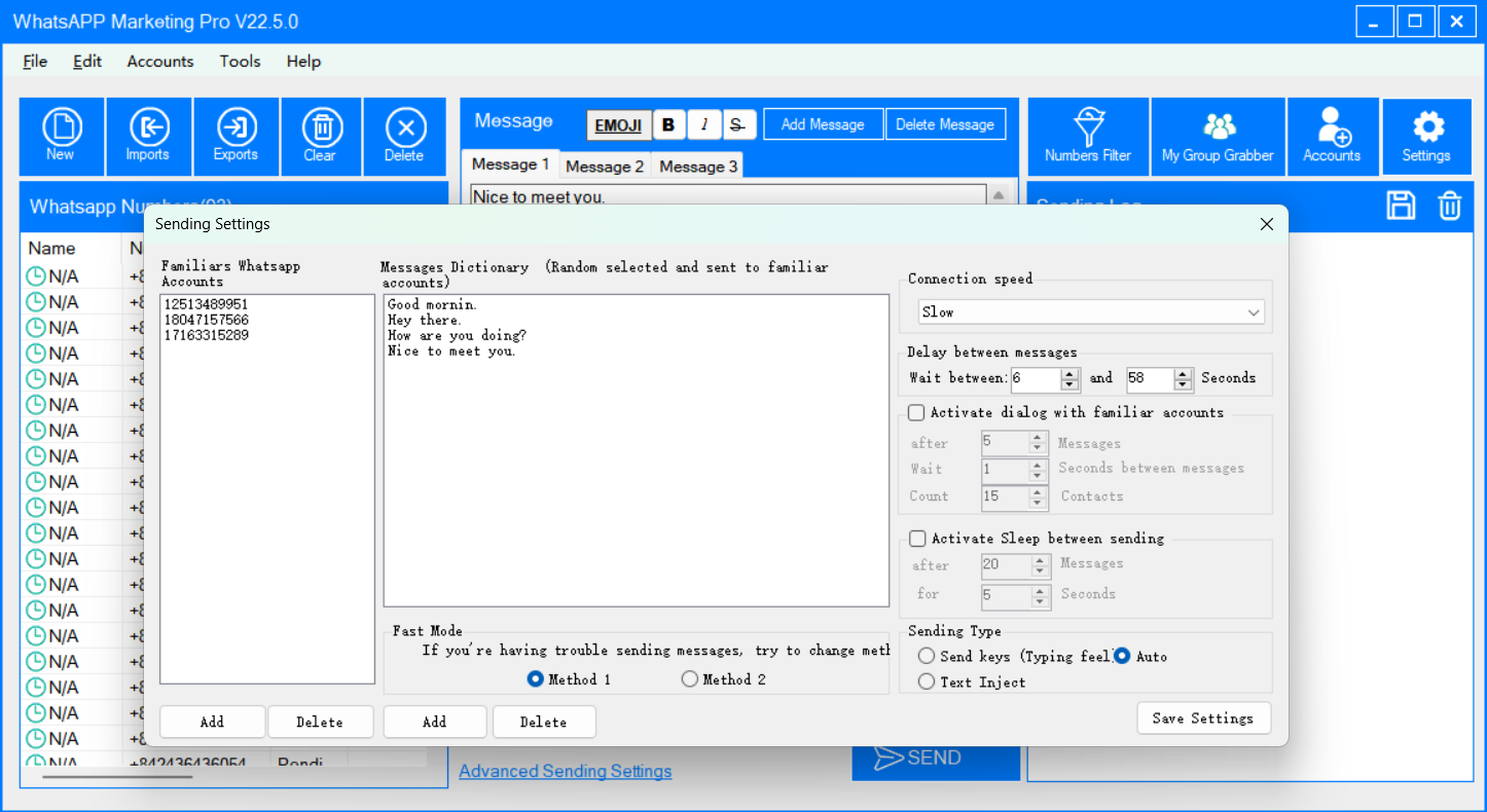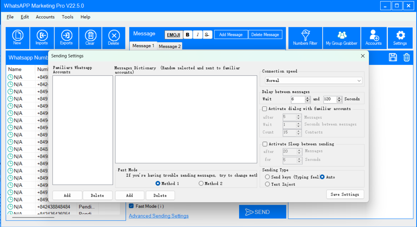SETTINGS: If you click on “Advanced sending Settings” on “Settings” button it will open a windows where you will find advanced send option that initiate dialog after “x” amount of messages to avoid blocking. You just have to set your familiar Whatsapp accounts and some message dictionary (random message that will be sent to your familiar accounts).