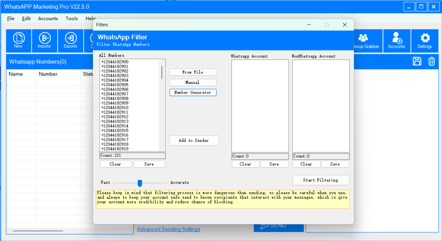 NUMBERS FILTER: this feature will allow you to know, given a list of phone numbers, those that are associated with a Whatsapp account and those that are not Whatsapp. Once the function is open, you must load all phone numbers (or use the number generation function) and then click on START FILTERING