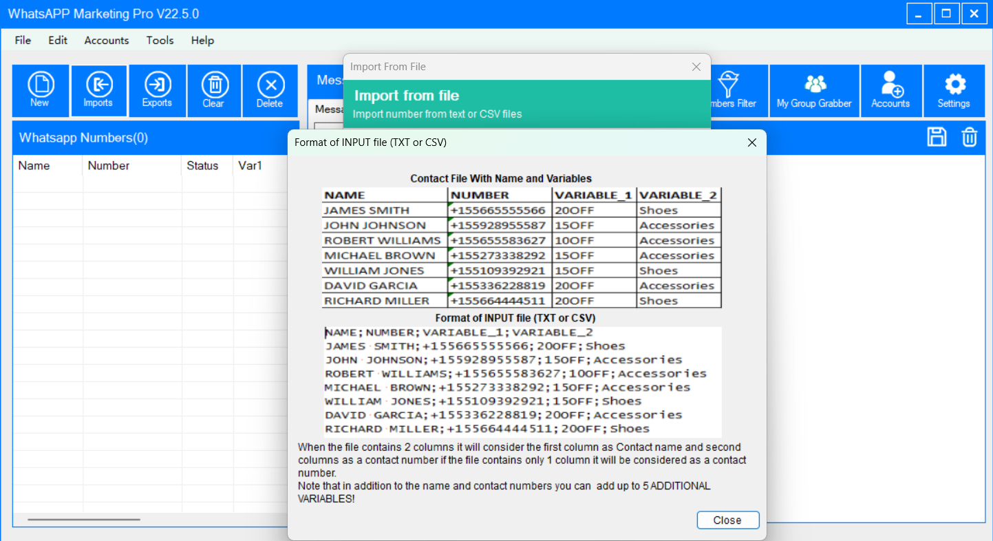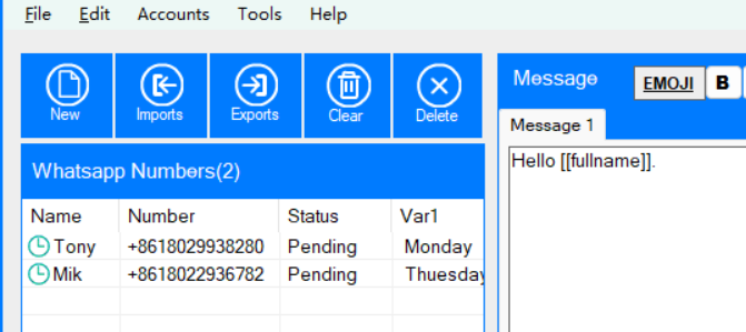 WhatsApp marketing system supports filtering and filtering numbers, importing numbers, sending custom messages in bulk, Multiple accounts take turns sending, sending on a regular basis, and setting multiple message variables. Generate any country number worldwide, extract contact and group member numbers, and other functions.