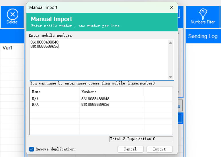 If you click on Manual Import it will open a window where you can add manually your contacts and enter name and mobile number (or mobile numbers only).