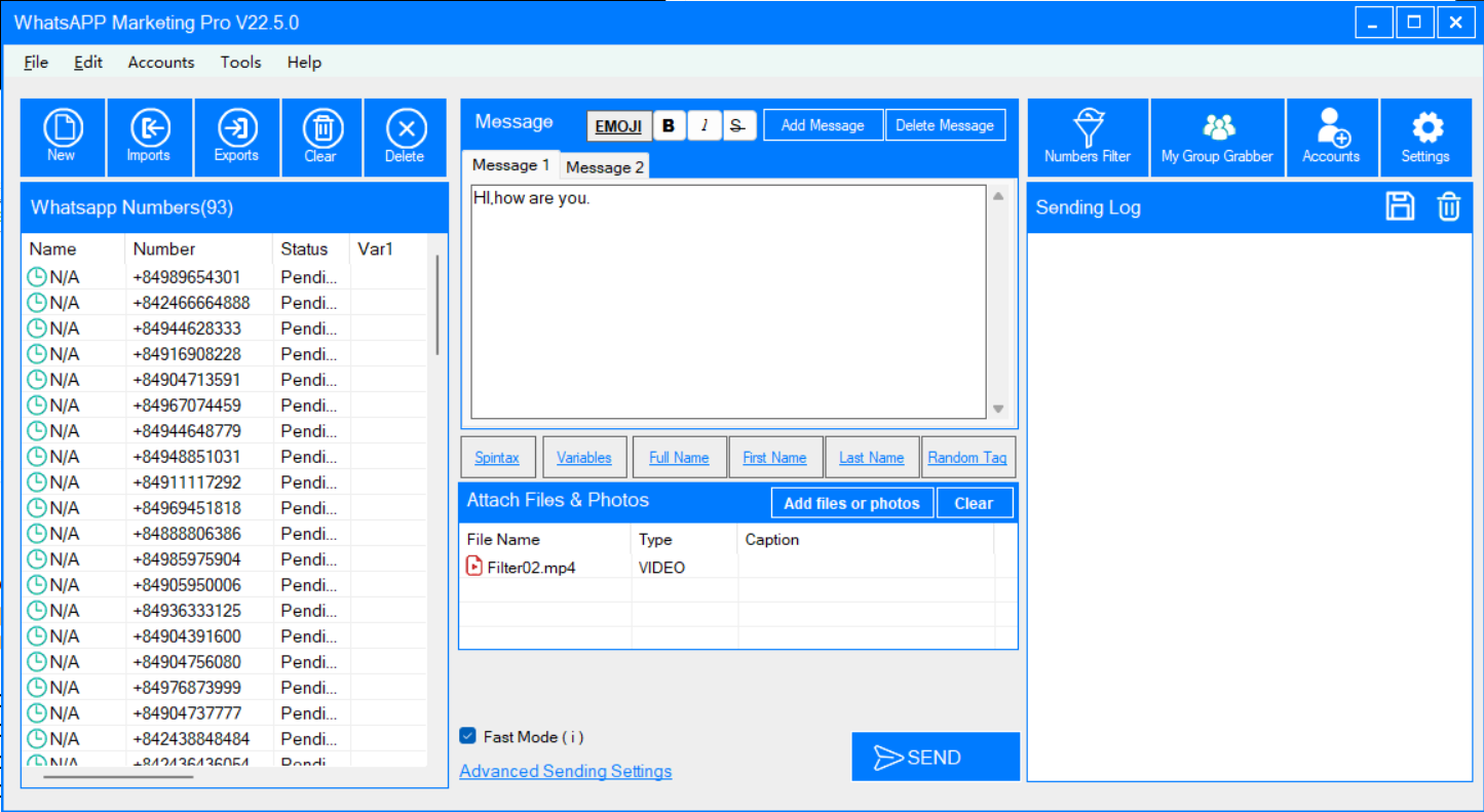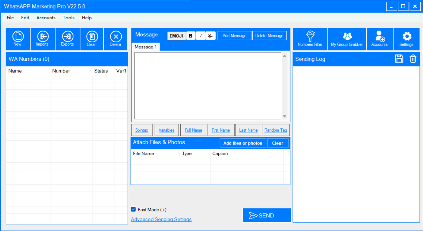 FAST MODE: this is a new way to send messages via Wapi. To enable it you have to flag the checkbox in the bottom of the main window of the program.The following figure: