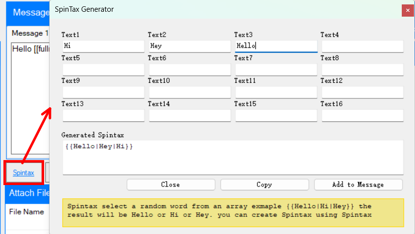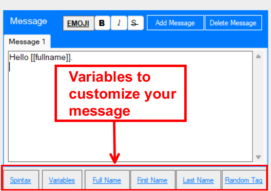 There is also a “SpinTax” link: it will allow you to set an array of words with the same meaning or synonyms (e.g Hello, Hi, Hey) and when you send the message, the program randomly will use them. In this way you automatically will send different messages and you will reduce the risk of “ban”.