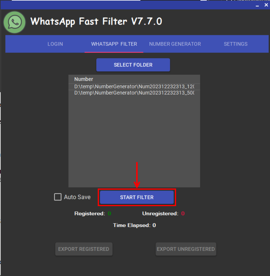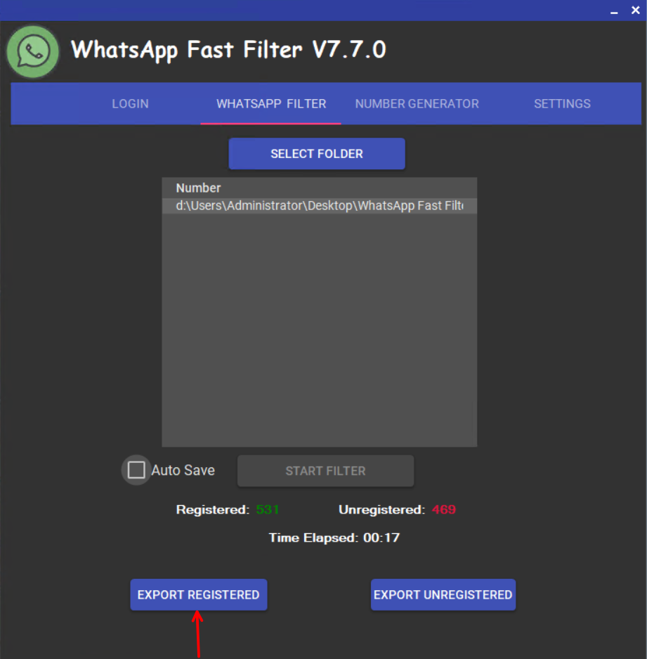 STEP 5. After filtering, CLICK EXPORT REGISTERED to export the registered numbers. You can also check AUTO SAVE before filtering to automatically save the filtering results.